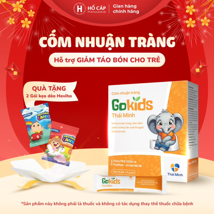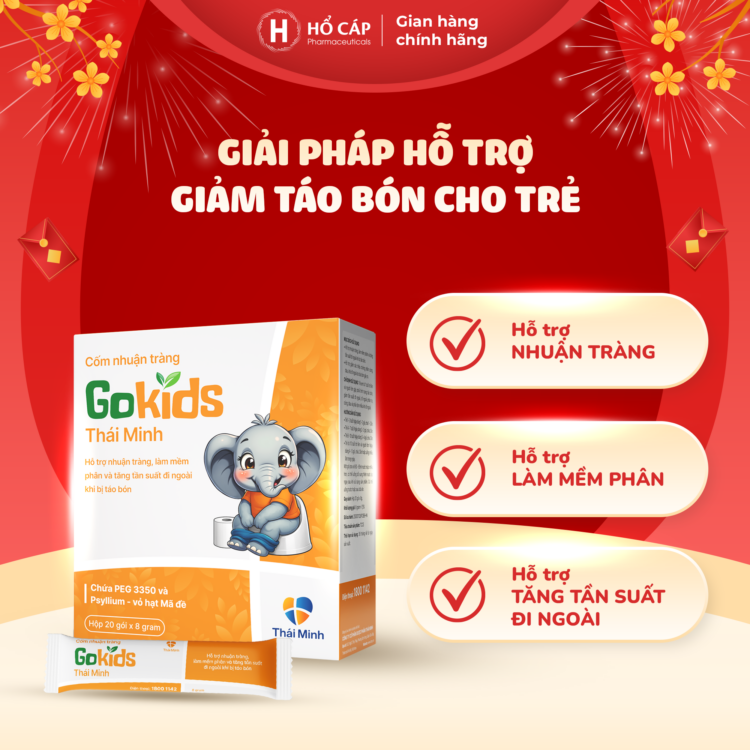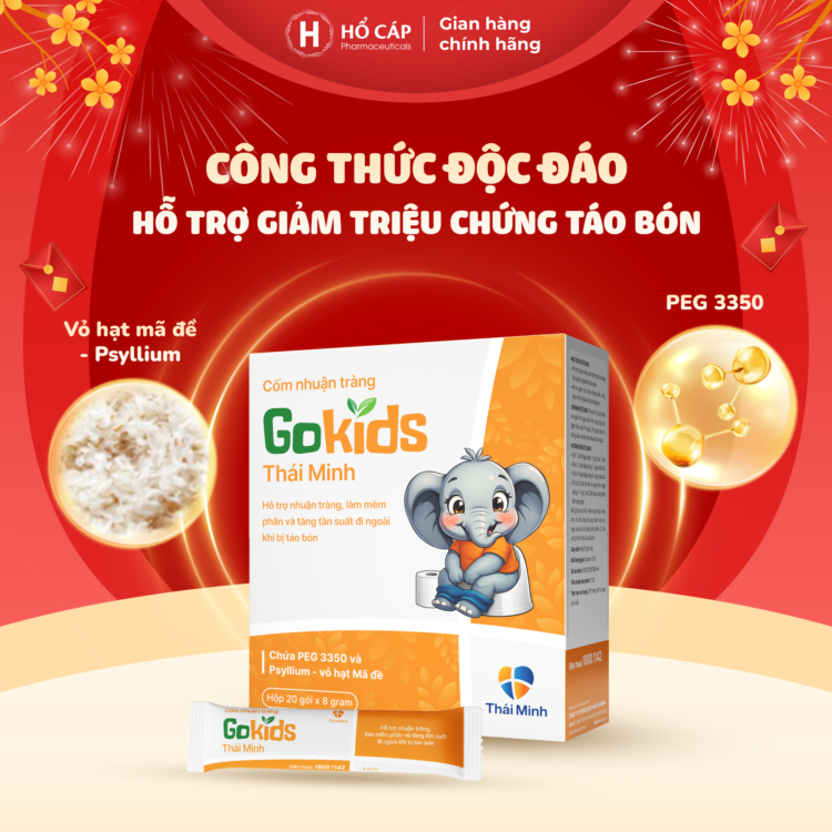 GoKids là cốm nhuận tràng thế hệ mới từ dược phẩm Thái Minh, được nghiên cứu và phát triển dành riêng cho trẻ em, hỗ trợ nhuận tràng, làm mềm phân và tăng tần suất đi ngoài khi bị táo bón. Hỗ trợ giảm các triệu chứng phân cứng, đau, khó đi ngoài do táo bón gây ra.