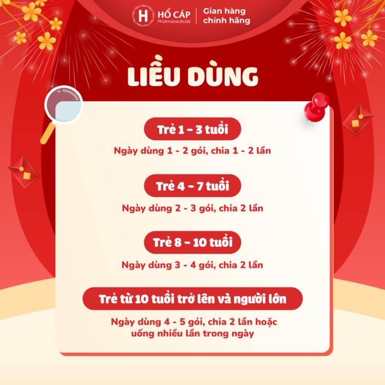 - Trẻ 8 – 10 tuổi: Ngày dùng 3 – 4 gói, chia 2 lần.